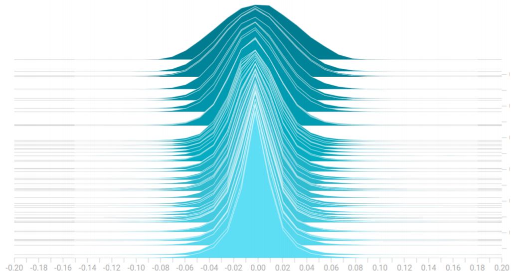 图 4:表示采用 SDR 的 DenseNet-100 的第 21 层第 1 块的权重值频率的直方图,其中每个切片都是来自训练一个 epoch 的 snapshot,而最上面的切片是来自第一个 epoch 的 snapshot。在训练 100 个 epoch 的过程中,随着权值的标准差趋近于零,曲线变窄。