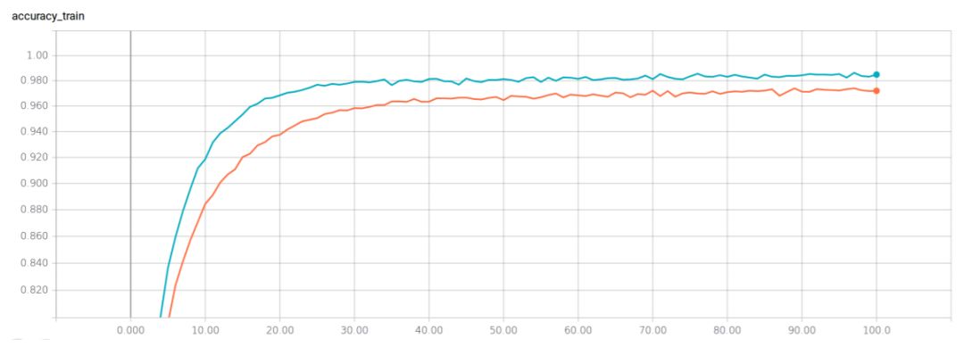 图 3:采用 dropout 的 DenseNet-100 训练 100 个 epoch 之后的准确率(橙色曲线)和采用 SDR 的 DenseNet-100 训练 100 个 epoch 的准确率(蓝色曲线)。比起 dropout,SDR 不仅能够更快地提高训练准确率(训练 17 个 epoch 达到了 96% 的准确率,drouout 达到相同的准确率需要 33 个 epoch),而且还能够在训练 40 个 epoch 后达到 98% 的准确率。