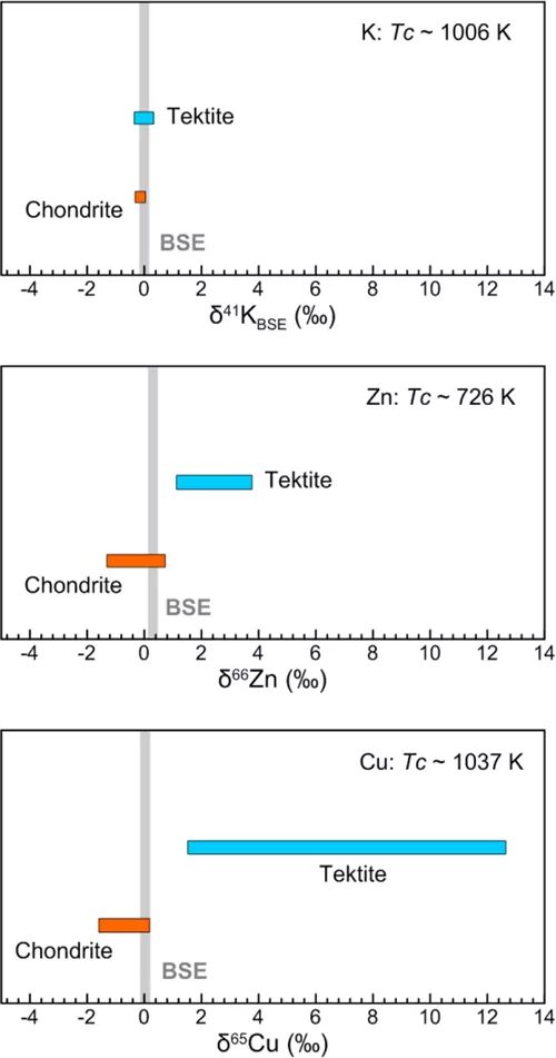 图:K、Zn和Cu同位素在全岩硅酸盐地球(BSE)、球粒陨石(Chondrite)和玻璃陨石(Tektite)中的分异程度对比