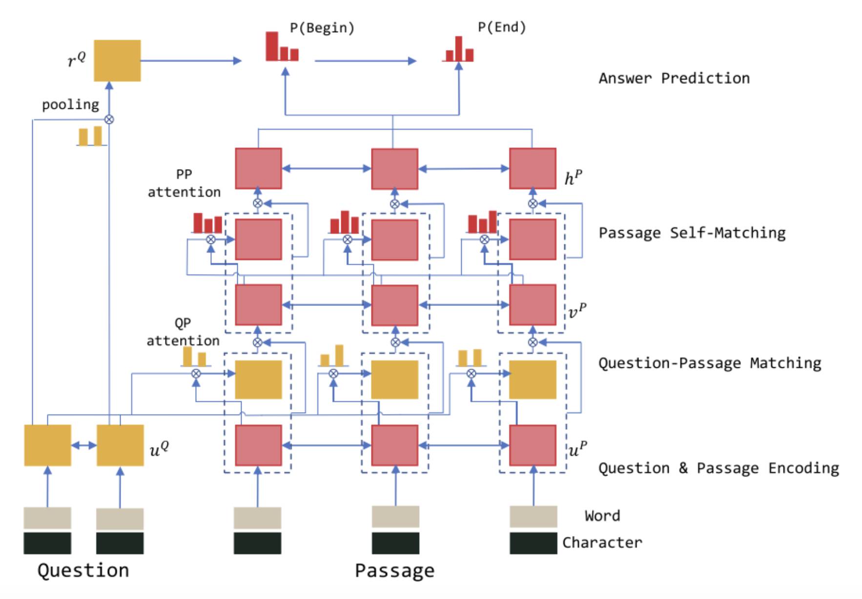 R-NET [13] 同样使用了双 Interaction 层架构,其第一 Interaction 层负责捕捉原文和问题之间的交互信息,而第二 Interaction 层负责捕捉原文内部各词之间的交互信息。