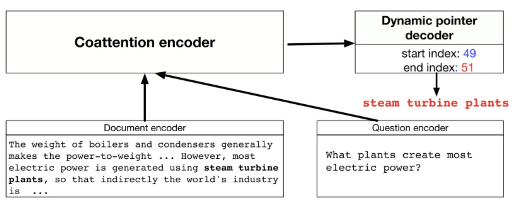 DCN [6] 最大的特点在于 Answer 层,其 Answer 层使用了一种多轮迭代 pointing 机制,每轮迭代都会产生对答案开始和结束位置的预测,并基于这两个预测使用 LSTM 和 Highway Maxout Network 来更新下一轮的答案范围预测。