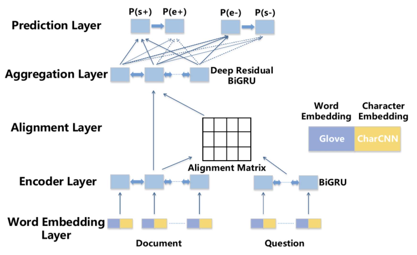 其中第一个 Interaction 层负责捕捉原文和问题之间的交互信息,第二 Interaction 层负责捕捉原文内部的长时依赖信息。
