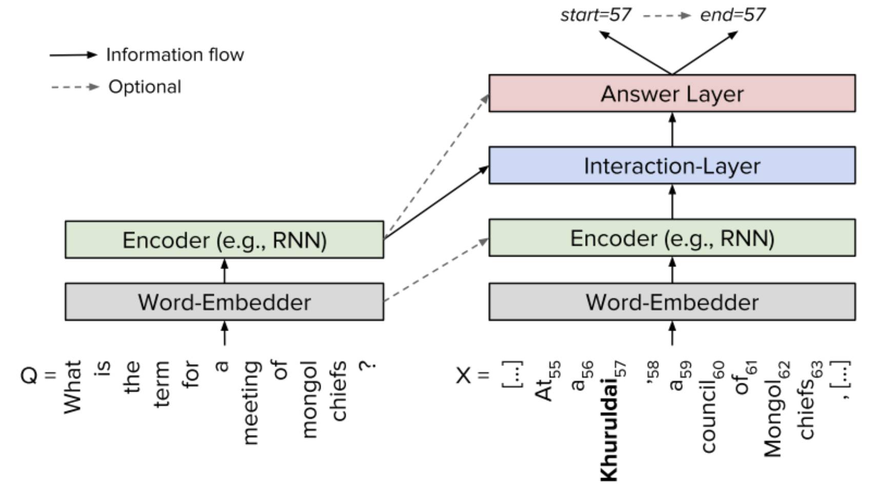 几乎所有做 SQuAD 的模型都可以概括为同一种框架:Embed 层,Encode 层,Interaction 层和 Answer 层。