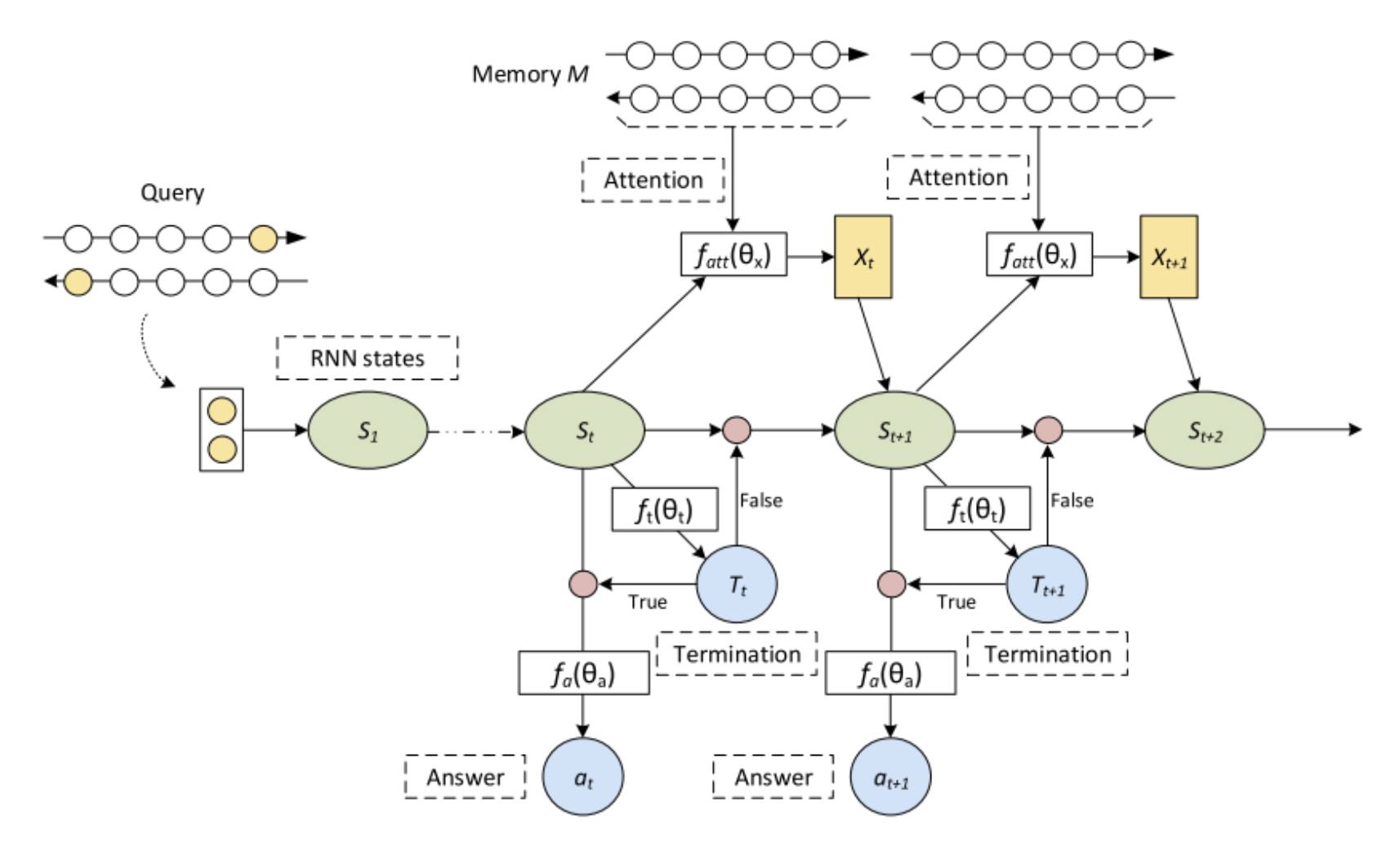 否则,中间状态 s 会和 Memory(原文和问题)中每一位表示计算注意力,并基于注意力求原文和问题的加权表示 x,x 和 s 共同作为一个 RNN 的输入,产生新的中间状态 s 并进入下一轮迭代。
