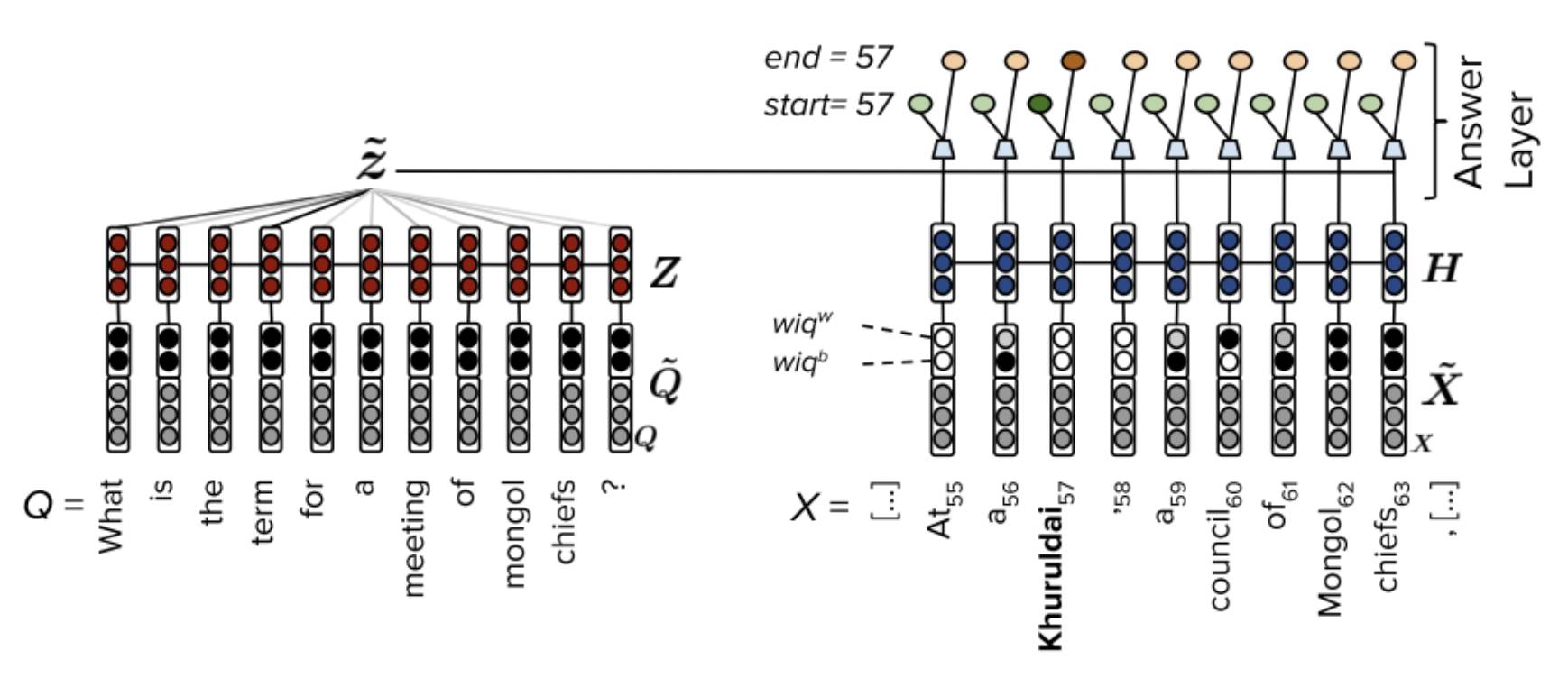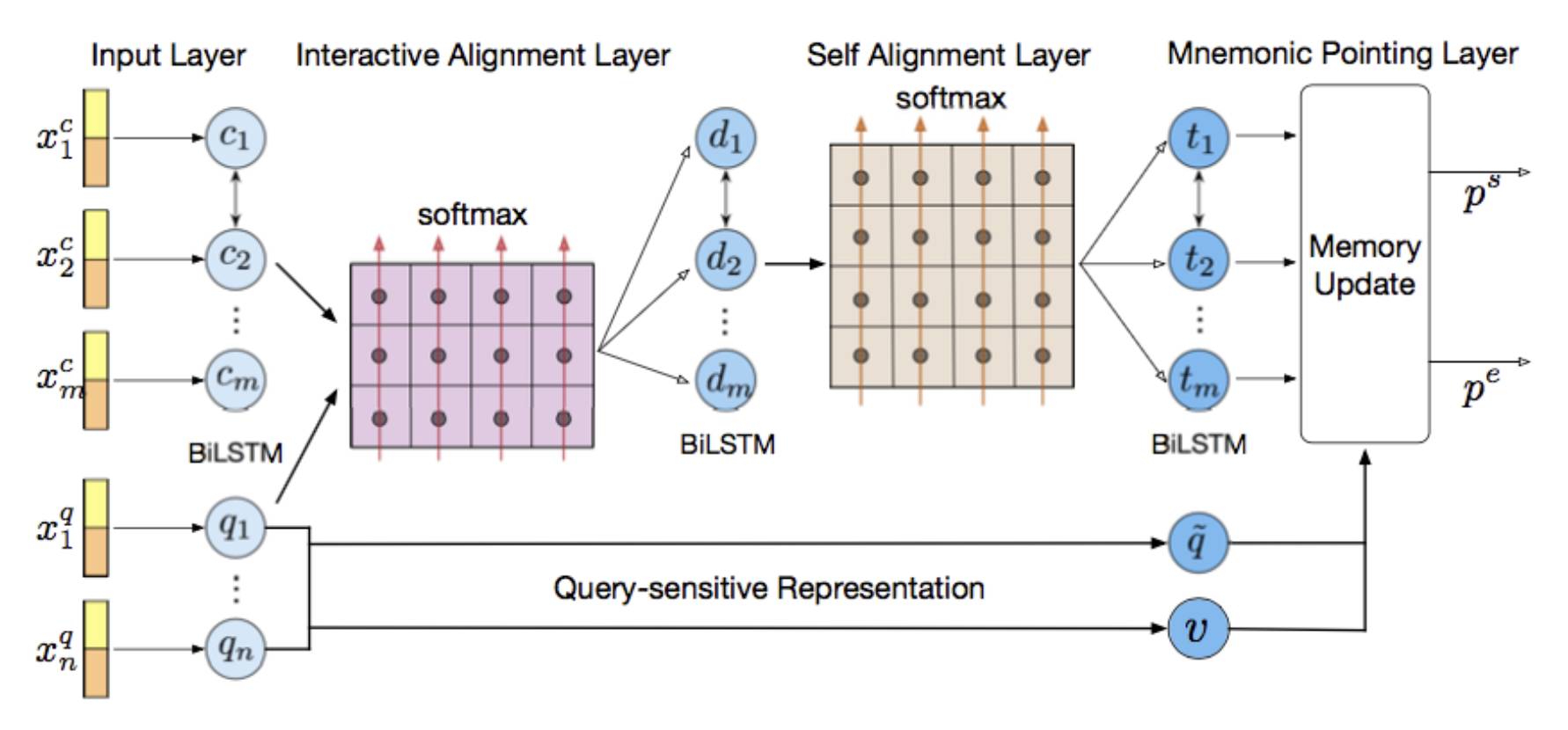 相比于之前的工作,我们的 Mnemonic Reader [14] 同样使用了类似于 r-net 和 Ruminating Reader 的两层 Interaction 层设计。