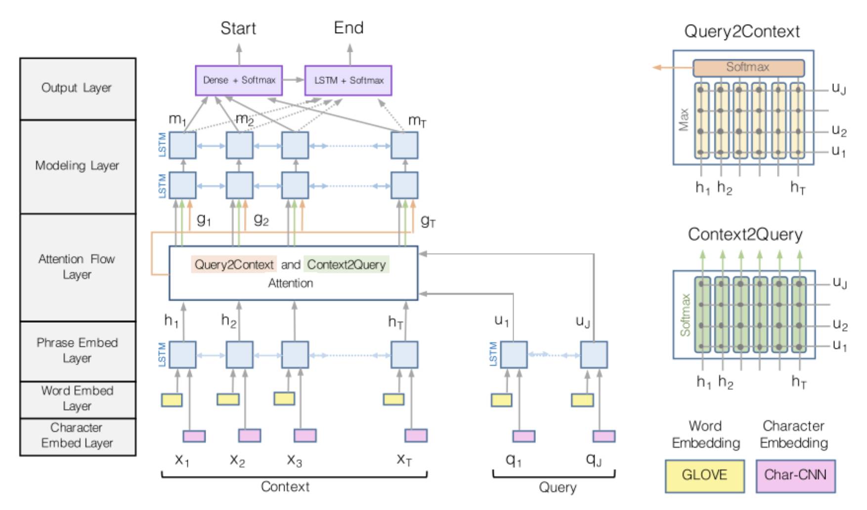相比于之前工作,BiDAF(Bi-Directional Attention Flow)[5] 最大的改进在于 Interaction 层中引入了双向注意力机制,即首先计算一个原文和问题的 Alignment matrix,然后基于该矩阵计算 Query2Context 和 Context2Query 两种注意力,并基于注意力计算 query-aware 的原文表示,接着使用双向 LSTM 进行语义信息的聚合。