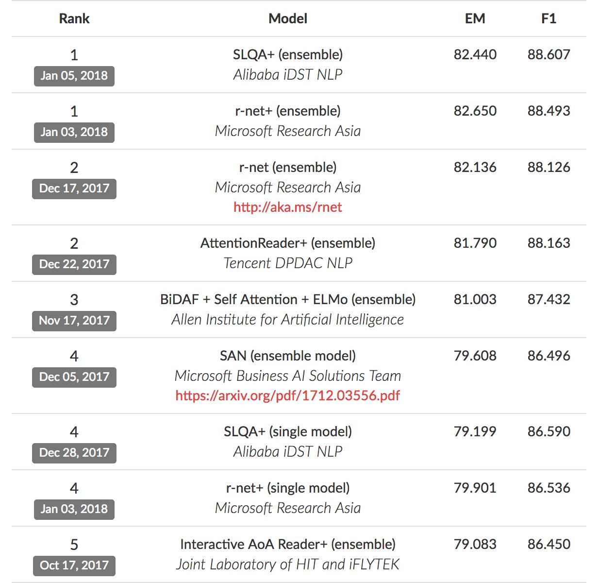 在斯坦福大学发起的 SQuAD(Stanford Question Answering Dataset)文本理解挑战赛中,微软亚洲研究院和阿里巴巴的 R-NET 模型和 SLQA 模型在 EM 值(表示预测答案和真实答案完全匹配)上分别以 82.650 和 82.440 的成绩率先超过人类(82.304)。
