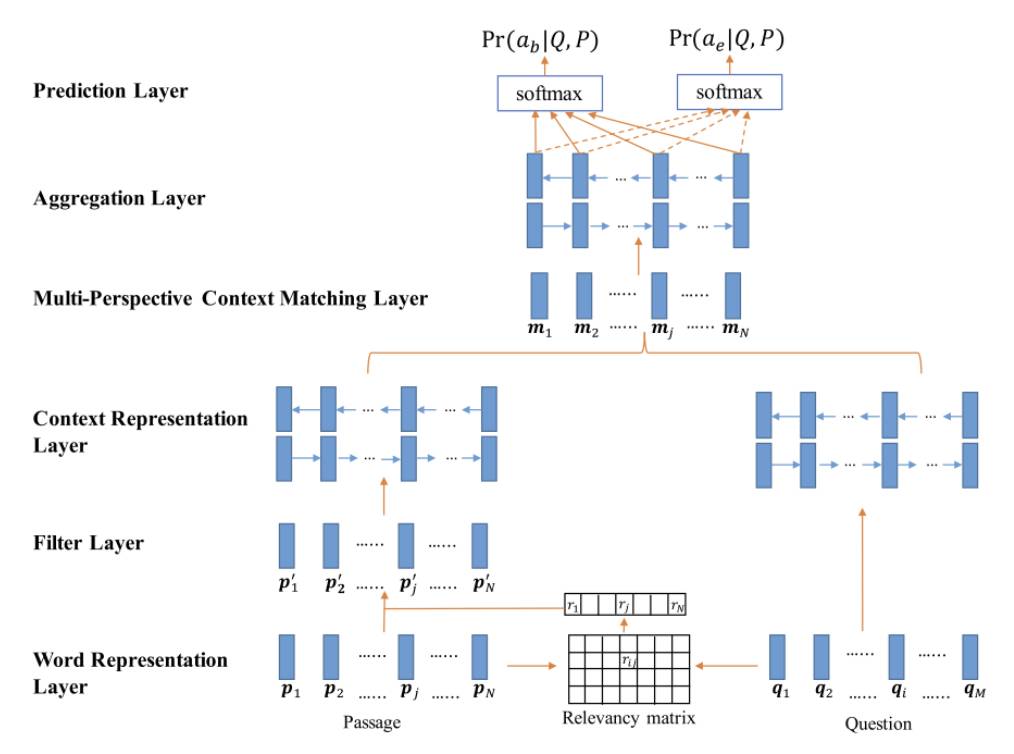 在 Encode 层之前,该模型使用一个过滤操作,作用是过滤掉那些和问题相关度低的原文词。该模型最大的特点在 Interaction 层,该层针对每个原文词使用一种 multi-perspective 的匹配函数计算其和问题的匹配向量,并使用 BiLSTM 来进一步聚合这些匹配向量。
