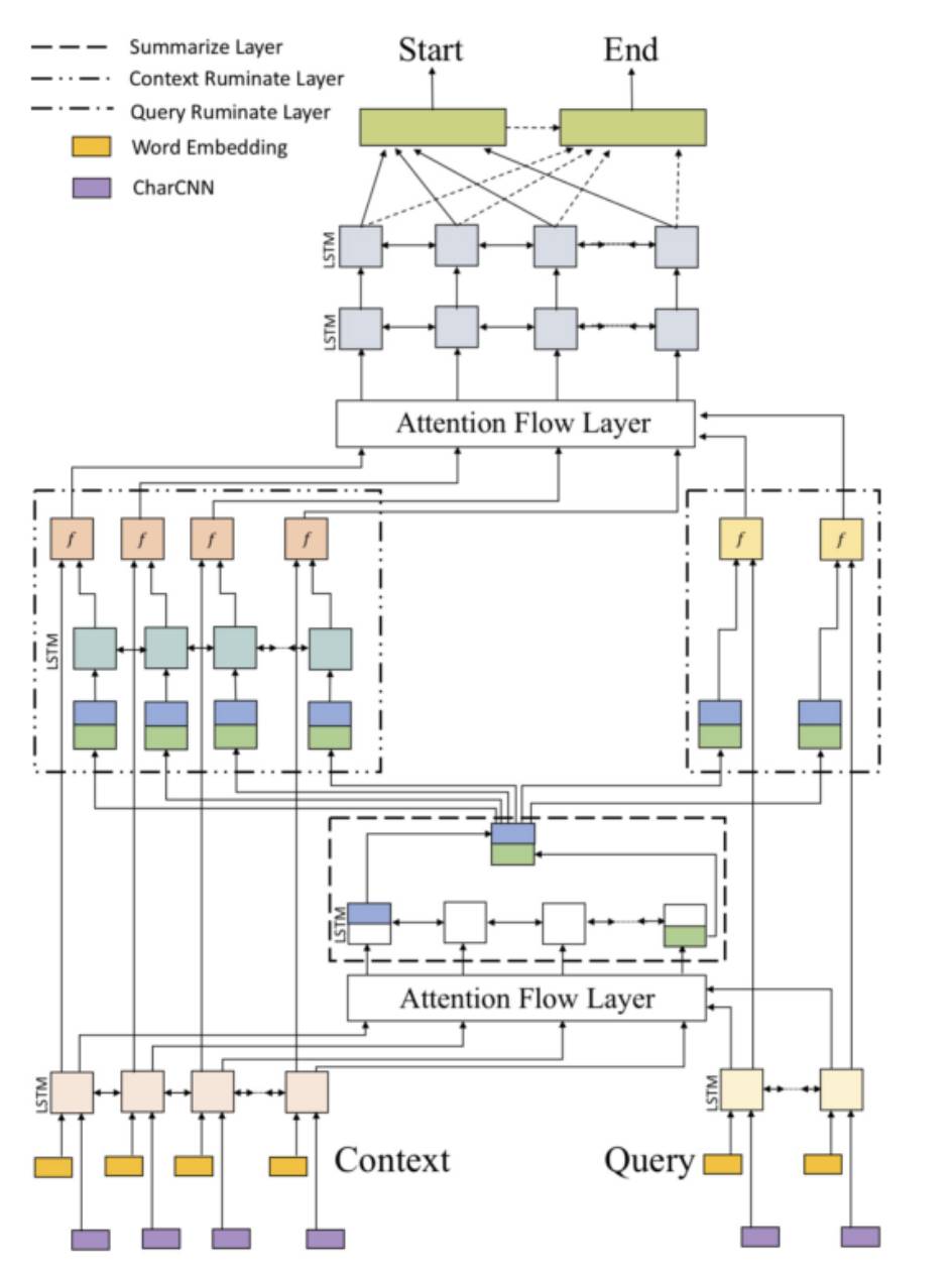 最后,基于更新后的原文和问题表示,使用第二个 Interaction 层来捕捉它们之间的交互,并生成新的 query-aware 的原文表示。Ruminating Reader 的 Embed 层,Encode 层和 Answer 层和 BiDAF 相同。