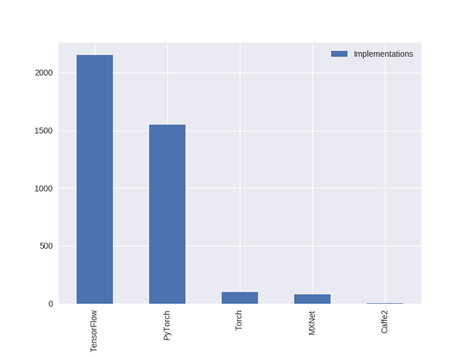 虽然PyTorch并不落后,但网站上的大多数实现似乎都是基于TensorFlow的。其他的框架(MXNet,Torch和Caffe2)在生态系统中的存在要小得多。鉴于两个框架中都发生了变化:TensorFlow正朝着即刻执行和由Keras激发灵感的新API方向发展;PyTorch则希望能够更轻松地把模型产品化。