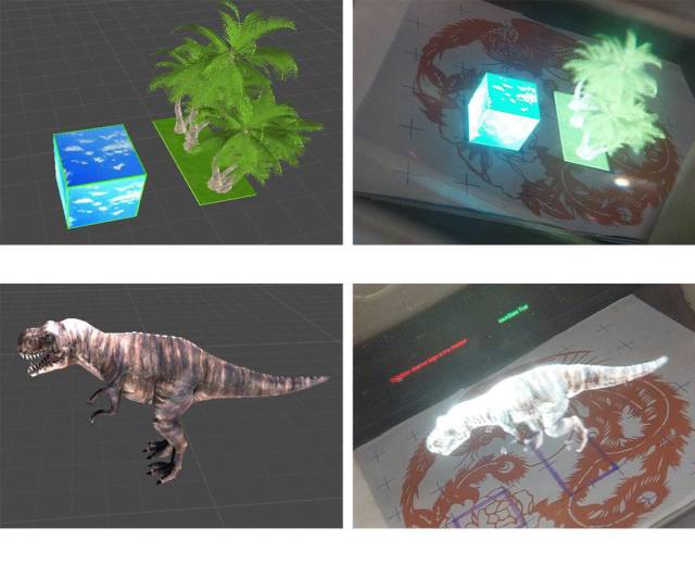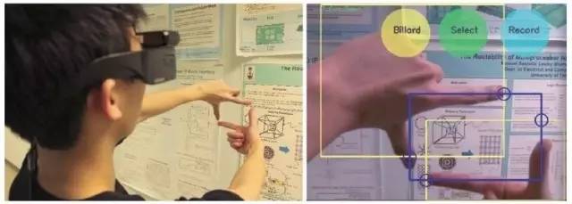 当然唯一不同的是,采用光学透射式头盔显示器以后,我们必须佩戴它才能从用户视角看到这些炫酷的效果。实际看到的可能是下面这样子的。该图选自一篇做人机交互的论文。