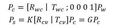 假设空间中的任意一点P,在世界坐标系W中的坐标为Pw,在跟踪摄像机坐标系下的坐标为Pc,通过屏幕看该点,该点在屏幕上的坐标为Ps,则得到两个等式