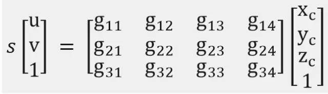 其中,Pw,Pc是三维位置的齐次坐标,因此都是四维向量。Ps是二维位置的齐次坐标,因此是三维向量。每一个出现的R都是3*3的旋转矩阵,每个T都是3*1的平移向量,它是包含3个元素的列向量。K是表示包含人眼的虚拟摄像机的内参数矩阵,是3*3矩阵。令Ps = [u v 1]T,Pc = [xc yc zc 1]T,G=[g11 g12 g13 g14 ; g21 g22 g23 g24 ; g31 g32 g33 g34 ],则得到
