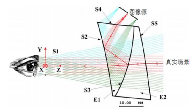 上图摘自一篇介绍光学透射式头盔显示器的论文,大致能表明这类显示器的基本结构。当然这款是自由曲面棱镜组成的,还有其他的类型如光波导镜片等。