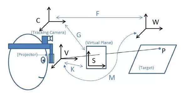 首先,必须明确几个用到的坐标系统。世界坐标系使用W表示,跟踪摄像机(跟踪摄像机用来建立本系统与外部环境之间的联系)坐标系使用C表示,头盔显示器的像面是一个2D的平面,采用S表示其平面坐标系,人眼与头盔显示器的像面组成一个针孔模型的虚拟摄像机,坐标系使用V表示。如果读者没有计算机视觉基础,可以参考清华大学出版社出版的《计算机视觉:算法与应用》一书,或者自行百度,也可搜索到相关介绍。针孔模型介绍可参考博文