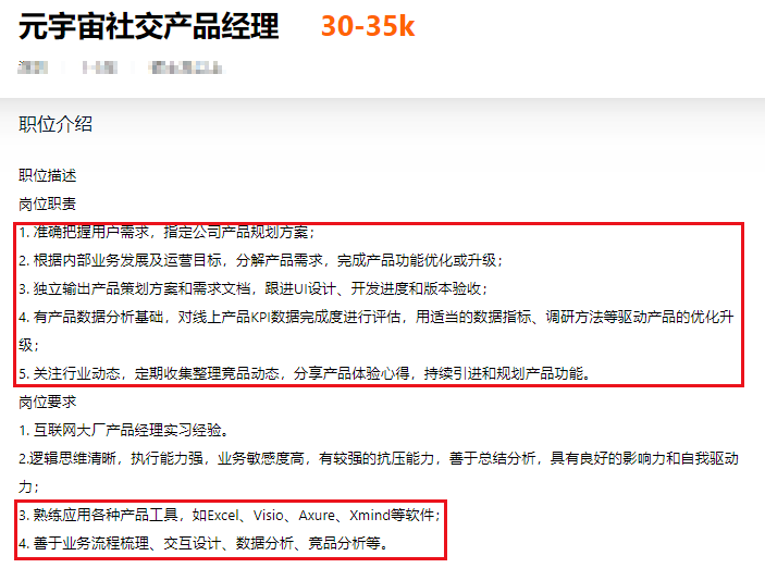 就拿猎聘上发布的一个30-35k的元宇宙社交产品经理招聘需求来举例,我们可以从中拆解出来,招聘方对候选人的要求是怎么样的: