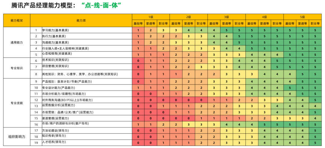 小编为大家列举了鹅厂1到5级的产品人能力模型,大家可以进行差缺补漏。