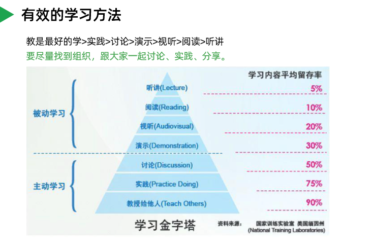 在美国著名学习专家爱德加·戴尔的学习金字塔模型中,我们可以看到:学习效果在30%以下的几种传统方式,都是个人学习或被动学习;而学习效果在50%以上的,都是团队学习、主动学习和参与式学习。
