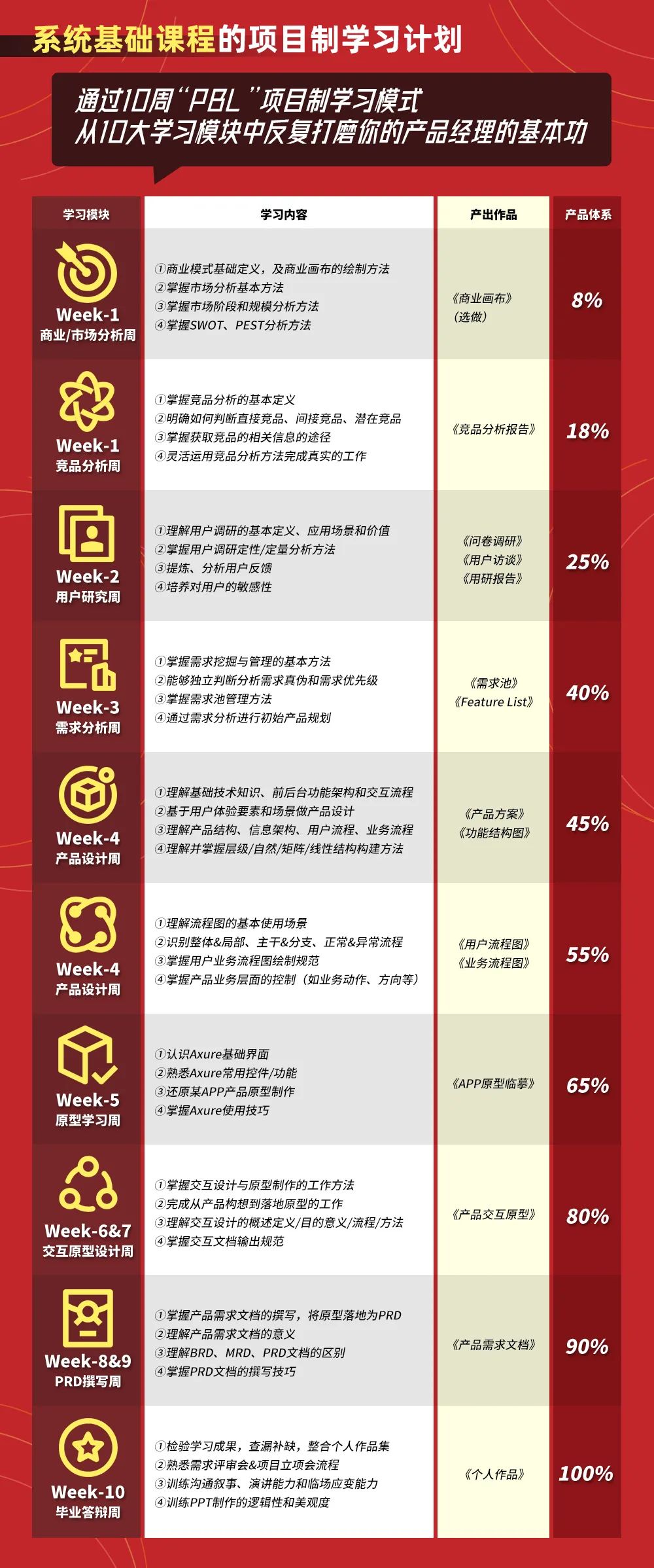 课程持续10周时间,你将在此期间通过大量烧脑的刻意训练,从市场/竞品分析、用户研究、产品定位、需求分析、产品规划、交互原型设计、产品管理等产品学习模块到毕业答辩,反复打磨产品经理的基本功。