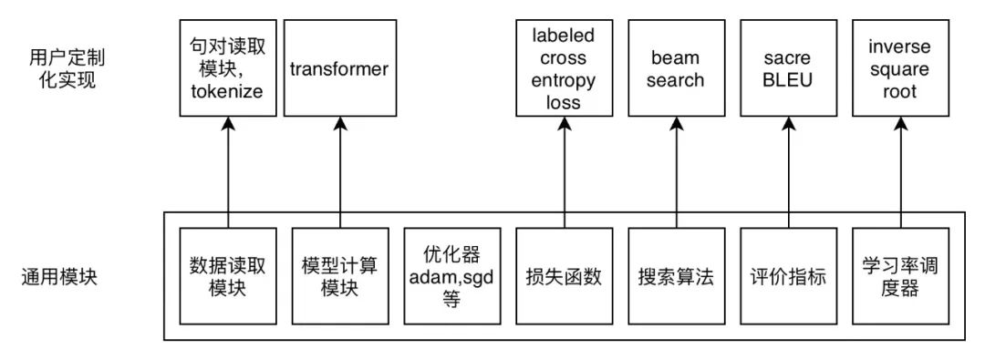 ParaGen 支持了多达 13 种可自定义模块,包括数据读入、数据预处理、数据采样、数据加载、网络模块、训练模型、推断模型、优化目标、搜索算法、优化器、数值规划器、训练算法和评价目标,相比于同类的文本生成框架,大大提高了二次开发的灵活性。而对于不同的模块,ParaGen 采用微内核的设计,每个模块只提供一些通用基本的实现,彼此之间互相独立,比如数值优化器中 InverseSquareRootRateScheduler、网络模块的 positional embedding、数据读入的 JsonDataset 等。也正是得益于这细致的 13 类模块拆解,ParaGen 可以更方便地进行自定义。例如需要实现 glancing training 的方式,在 ParaGen 里面仅仅只需要重载一个 forward_loss 函数,就可以模块化的实现自定义的训练。