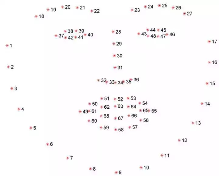 上面下载的模型数据是用来估计人脸上68个特征点(x, y)的坐标位置,这68个坐标点的位置如下图所示: