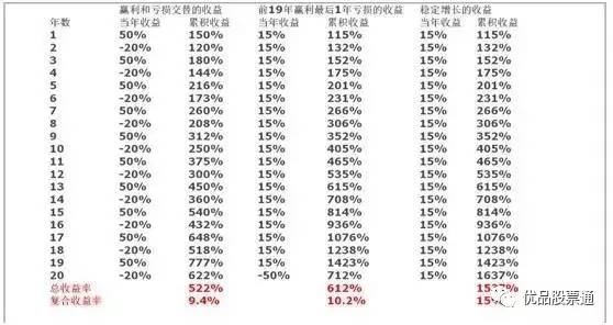 可以看到,在这张表格的中间一栏,每年都是15%的增长,到第二十年的时候,如果这个增长突然中断,假设这个年度的收益率回撤50%,你如果有一年表现比较差,那么这二十年积累的总体收益相差是非常大的。