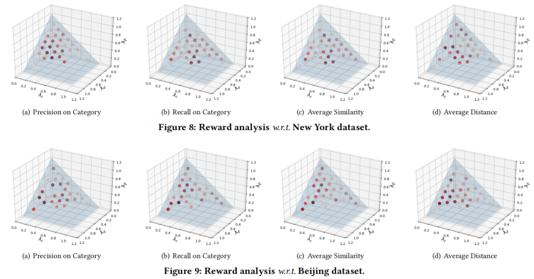(3)奖励不同部分权重的影响。一个有趣的观察结果是,在“类别精确度”,“类别召回”和“平均相似度”的情况下,类别相似度 的贡献高于其他两个因素,但在“平均距离”情况下 ,距离 和POI 是否访问 的贡献超过类别相似度 。原因很直观,类别相似度 直接决定了策略训练的方向,以探索更多相似的POI类别,而 和 则指导策略找到与用户意图尽可能接近的POI。