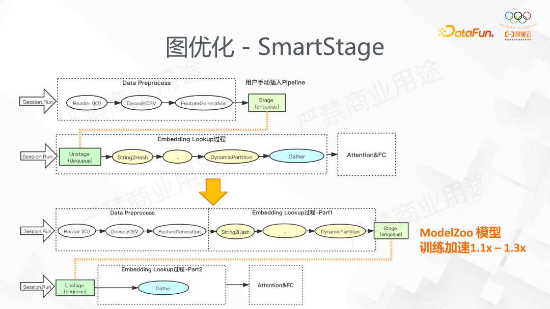 我们看到稀疏模型的训练通常包括样本的读取,EmbeddingLookup,还有MLP 的网络计算。样本的读取和 Embedding 查找往往不是计算密集型的,并不能有效利用计算资源。原生框架提供的 prefetch 接口虽然能一定程度上完成异步操作,但是我们在 EmbeddingLookup 过程中设计部分复杂的子图,这些不能通过 TensorFlow 的 prefetch 实现流水线。TensorFlow 提供的流水线功能,实际使用中需要用户显示的指定 stage 边界,一方面会提高使用难度,另一方面由于 stage 的精度不够,无法精确到 op 级别。对于 High Level 的 API 用户无法手动插入,会导致很多步伐并行化。下图是 SmartStage 的具体操作,它会将 Op 自动的归类到不同的 Stage,使得并发的流水线能得到性能的提升。我们在 ModelZoo 里模型的测试效果最大加速比能达到 1.1-1.3。