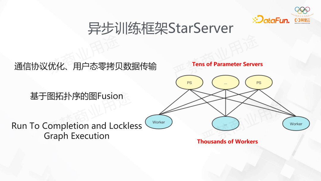 StarServer 在图的线程调度、内存的优化方面做得很好,将框架中Send/Recv 修改为了 Push/Pull 语义,PS 在执行的时候使用了 lockless 的方法,极大地提高了执行的效率。我们对比原生框架有数倍的性能提升,并且在内部 3Kworker 左右的数量能达到线性的扩展。