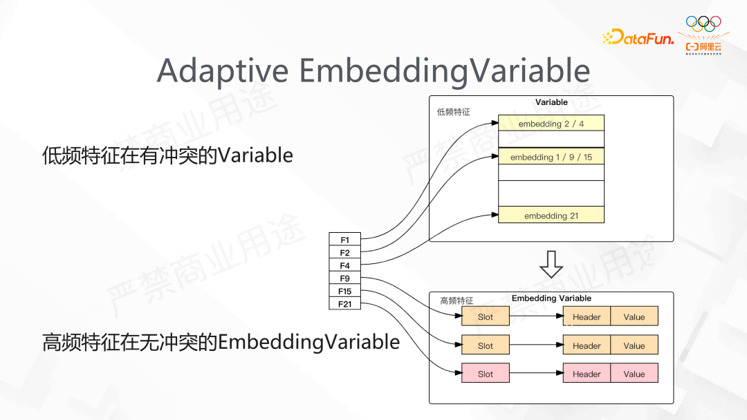 将静态的 Variable 转化为动态的类似 HashTable 的存储,每来一个 key,新创建一个 Embedding,这样就天然地解决了特征冲突的问题。
