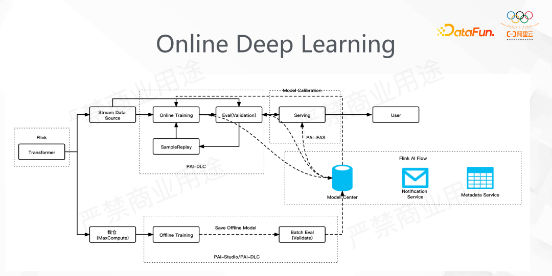 最左边是样本处理,上下两部分是离线和在线的训练,右边是 serving。这里面应用了很多 PAI 的组件来完成 Pipeline 的构造。