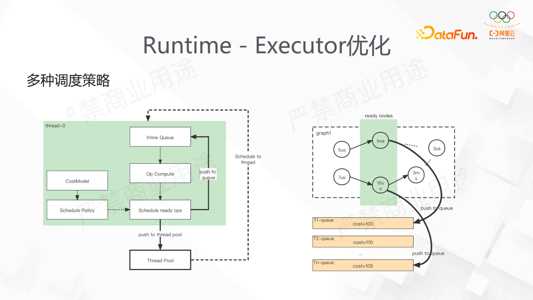 TensorFlow 原生的 Executor 的实现十分简单,首先对 DAG 做拓扑排序,随后将 Node 插入到执行队列中,通过 Task 利用 Executor 调度。这样的实现没有结合业务考虑,ThreadPool 默认使用了Eigen线程池,若线程负载不均匀,会发生大量的线程间抢占 Steal,带来极大开销。我们在 DeepRec 中定义调度更均匀,同时定义了关键路径使得在调度的时候有一定的优先级顺序,来执行 Op。最终 DeepRec 也提供了多种包括基于 Task,SimpleGraph 的调度策略。