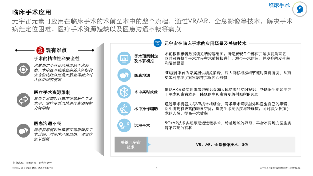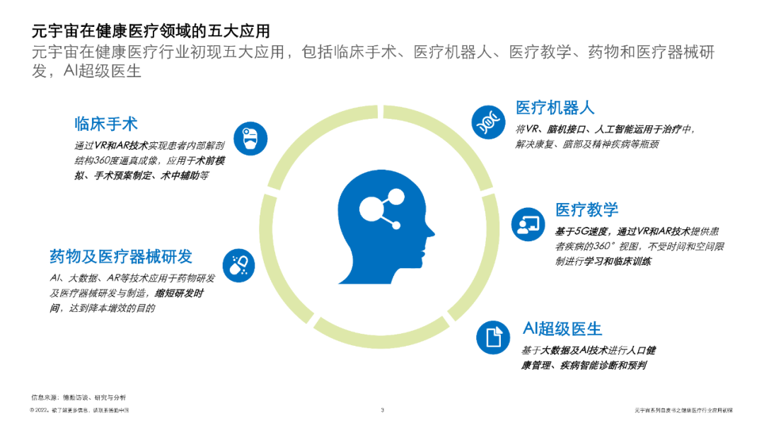 白皮书列举出了临床手术、医疗机器人、医疗教学、药物及医疗器械研发和AI超级医生等元宇宙在医疗健康领域的五大应用概况及其案例。