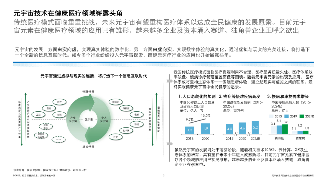 我国传统医疗模式面临医疗资源利用不合理、医疗服务质量欠佳、医疗体系效率较低、慢病诊疗管理覆盖面低等困境。随着元宇宙元素的出现及应用, 医疗体系或将重构生态体系——围绕患者体验,建立起现实与虚拟之间的联系,最终实现健康元宇宙中全民健康的愿景。虽然元宇宙的发展尚处于萌芽阶段,随着相关技术如5G、云计算、XR及生态体系的培育,其有望在未来十年进入成熟阶段。目前元宇宙元素在健康医疗各个领域的应用已初见雏形,越来越多的企业及资本正涌入赛道,独角兽企业正在孕育中。