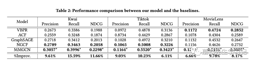 在实验部分作者使用了头条数据集tiktok,快手数据集Kwai,movie-lens进行实验。头条数据集3种模态都有,快手只有文本和图像。movie-lens作者手动爬取了youtube的预告片,并用resnet50提取关键帧的特征,使用FFmpeg抓取声音片断并用VGGish提起声音特征,使用Sentence2Vector从文本描述中提取特征。这个工作量是真大。
