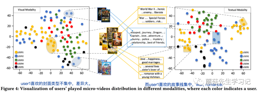 作者可视化用户对同1个item的不同模态的特征的偏好不一致性也值得学习。通过分析学习到的item的多模态降维表示,并抽取部分用户交互过的item,看交互过的item的降维表示的分布情况,例如,在视觉模态下,交互过的item比较分散,说明这些items的封面/帧/图像差异较大;而文本模态下,交互过的item表示向量点比较集中。则说明了用户对视觉模态没有太多的偏好,不是对其兴趣起决定性作用;而对文本域的模态有典型的偏好,例如喜欢看浪漫主题的电影。如下图中的user 1,左图视觉域点分布很分散;右图文本域集中在war和romance主题。相反,有的人可能很关注视觉模态,比如爱看封面美女的电影,那么其视觉模态下的表示就很集中;而可能这些电影主题差异很大,即文本模态下很分散。