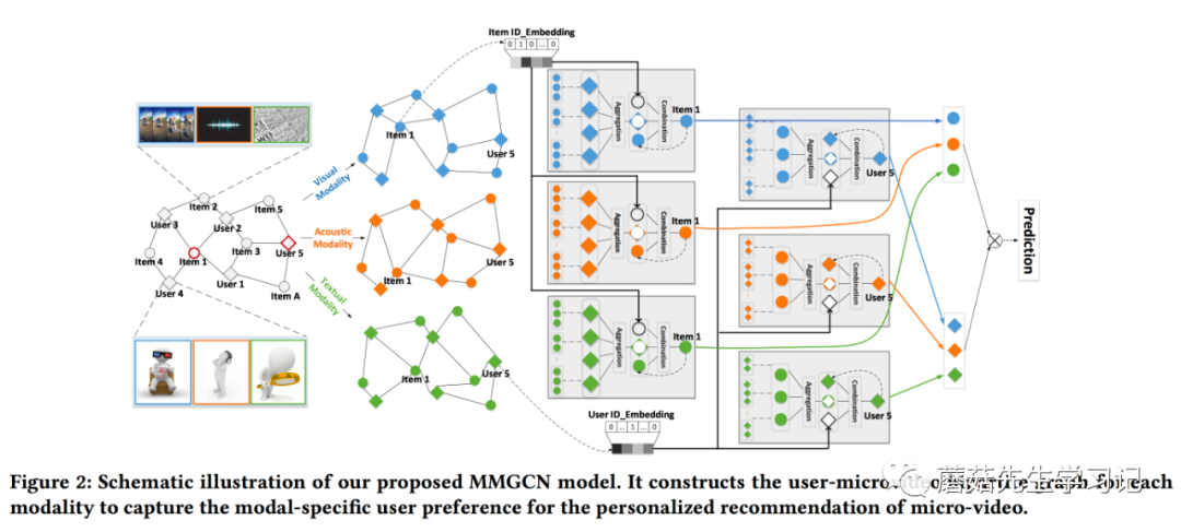 作者希望能够通过关注user-item在不同模态空间下的信息交互,借鉴GNN的信息传播机制来编码用户和视频在不同模态下的高阶关系,进而捕获特定模态内容下用户的偏好。