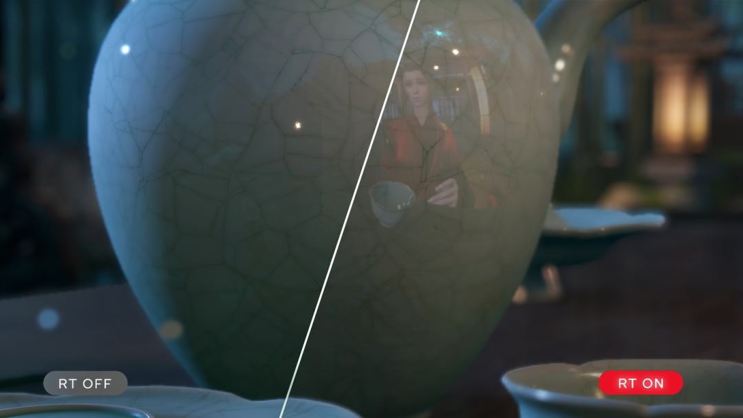 例如在极富武侠情调的演示场景中,不开启光追效果时虽然能够表现出水面的波光、涟漪,并微弱地映射出水面上的其他物体,但无法达到全反射的镜面效果。而在开启实时光追效果后,游戏引擎可以按照真实的光线反射规律渲染画面,侠客、竹林、天空被清晰地倒映在水面中,色彩真实绚烂,画面层次感清晰。除了静态水面反射外,游戏中刀剑金属表面也支持光线反射,一剑刺来,寒芒闪耀,带来更有压迫感的光影享受。甚至是瓷器、陶片这种光洁表面也都能够呈现不同反射率的逼真光影反射效果,精准呈现更多画面细节。