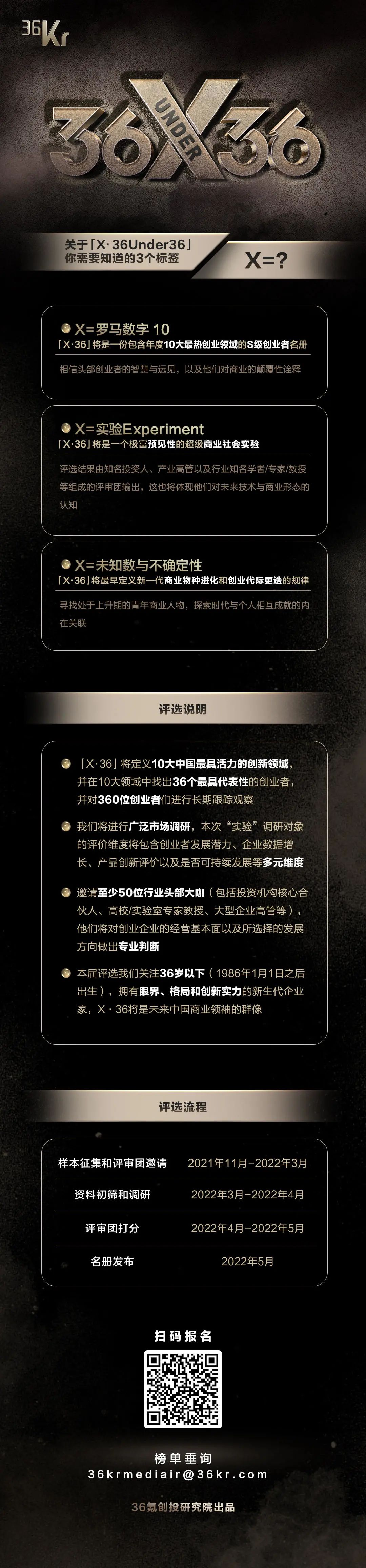 我们相信,中国正在、也已经涌现了一批崭新风貌的创业者。去年11月,36氪启动了「X·36under36」征集计划,也正基于这样的前提,我们旨在更早和更大范围地发掘可能伟大的创业者。