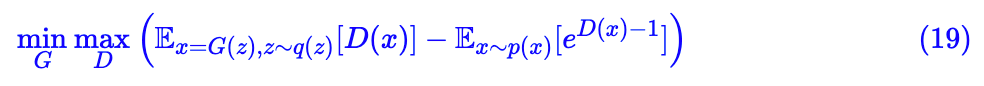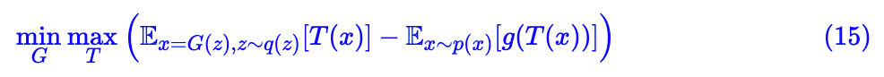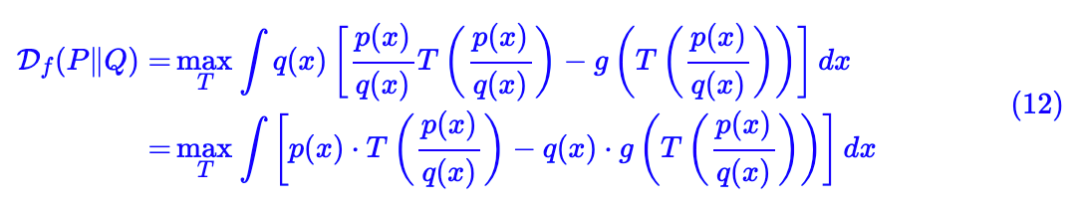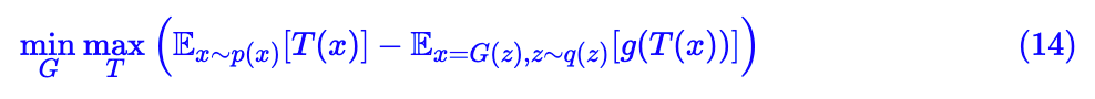 式 (13) 就是估计 f 散度的基础公式了。意思就是说:分别从两个分布中采样,然后分别计算 T(x) 和 g(T(x)) 的平均值,优化 T,让它们的差尽可能地大,最终的结果就是f散度的近似值了。显然 T(x) 可以用足够复杂的神经网络拟合,我们只需要优化神经网络的参数。