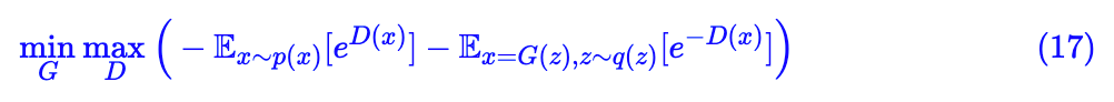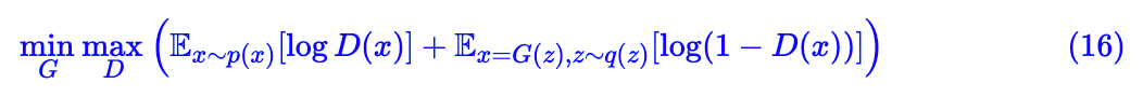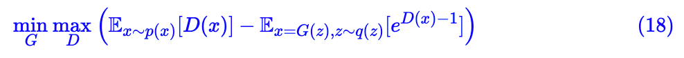 GAN 希望训练一个生成器,将高斯分布映射到我们所需要的数据集分布,那就需要比较两个分布之间的差异了,经过前面的过程,其实就很简单了,随便找一种 f 散度都可以了。然后用式 (13) 对 f 散度进行估计,估计完之后,我们就有 f 散度的模型了,这时候生成器不是希望缩小分布的差异吗?最小化 f 散度就行了。所以写成一个表达式就是: