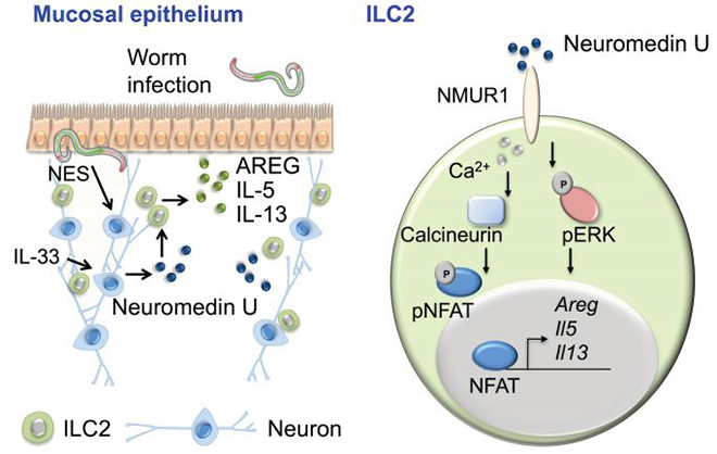 非常巧合的是美国康奈尔大学等单位的研究人员也发现ILC2和名为胆碱能神经元的神经细胞近距离地在一起,进而探索先天淋巴细胞是否和神经元相互作用,发表了题为“The neuropeptide neuromedin U stimulates innate lymphoid cells and type 2 inflammation”的文章。