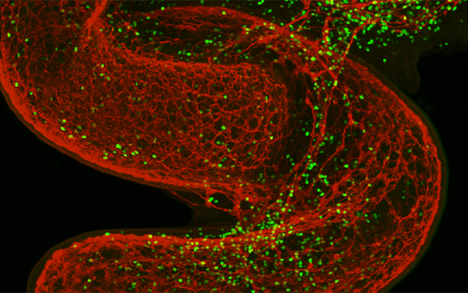 先天淋巴细胞(绿色)围绕着肠道(红色)图片来源 Henrique Veiga-Fernandes