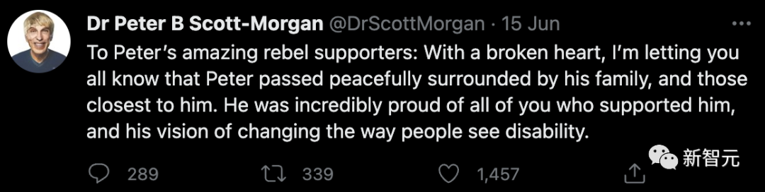 推特中写道,「彼得一直以来都有很多坚定的支持者和粉丝。但是我不得不怀着悲痛的心情告诉所有朋友们,彼得刚刚去世了。他走的很安详,病床边上围满了他的家人和他最亲近的人。我想说,彼得很感谢你们所有人一直以来的支持,他也很自豪,能够为残疾人出一份力。」