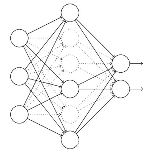 假设我们要训练上图这个网络,在训练开始时,我们随机地“删除”一部分的隐层单元,视它们为不存在。