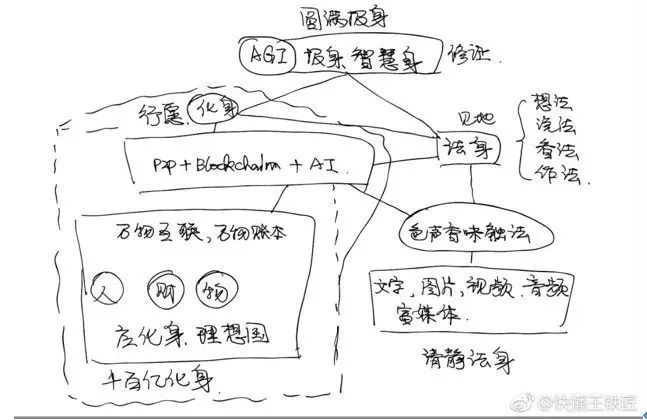 在一张手稿中,王欣将自己对于未来科技的理解,划分为了佛教中的法身、化身、报身。