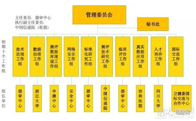 人工智能医疗器械创新合作平台由中央国家机关事业单位、学会、医疗机构与高校共同参与构成。管理委员会统一管辖下属10个初期工作组,各个工作组又由不同的机构参与管理。