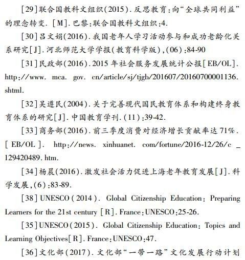 2015年底,我国60岁以上老年人口已达到2.22亿(民政部,2016)。老年人群学习需求明显增加,老年教育快速发展。到2014年底,全国各级各类老年大学、老年学校已建成5.97万所(上海开放大学课题组,2016),700多万老年人参与学习,初步形成了多部门推动、多形式办学的发展格局。事实表明,参与学习活动有助于老年人拓展知识面、提升家庭生活满意度、积极应对晚年生活、提高日常生活质量、扩大社会交际空间等。总之,老年教育已然成为促进积极老龄化的重要推力(吕文娟,2016)。