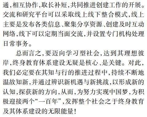 过往认知与实践经历的回溯,以及对现实机遇和挑战的分析,为学习型社会创建、终身教育体系建设提供了多方面、多层次的前行坐标。基此,下文试以全景视野,顺应时代趋势,提出发展思路与对策。