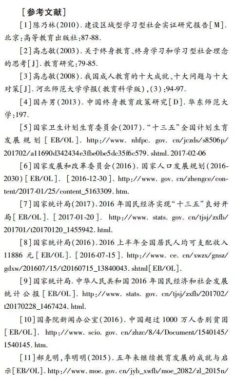 保障民生、改善民生,创新社会治理,推动经济社会协调与可持续发展,构建稳定、健康、和谐社会是21世纪我国社会建设的目标。在党和国家长期的努力下,我国社会贫困情况明显改善,2016年1000万人脱贫,人口贫困率下降到5.7%(国务院新闻办公室,2016)。人民参与公共事务和公益事业热情亦空前高涨。但依然需要清醒的是,发展也在不同程度上导致生态环境恶化、自然资源短缺、城乡社区分离、弱势群体返贫以及社会公共参与能力欠缺等诸多困境(中华人民共和国环境保护部,2016)。此外,2016年我国的基尼系数为0.465,仍处于世界高水平,城乡居民收入差距为2.72倍。⑤显然,所有这些经济社会问题都需要进一步得到密切关注和妥善解决。社会总体稳定和健康发展,基本公共服务体系不断完善,给各级各类教育发展与改革提供了基础保障和支持环境。但需要注意到,有关社会动态不平等的事实给出的警示是:教育在促进社会平等方面的功效并不尽如人意(吉米·道华德,2016)。也就是说,若要真正发挥终身教育在促进社会健康流动,提升社会发展活力,不让“有人掉队”,显然还需要加强教育与社会之间更加理性的认识和系统的规划。